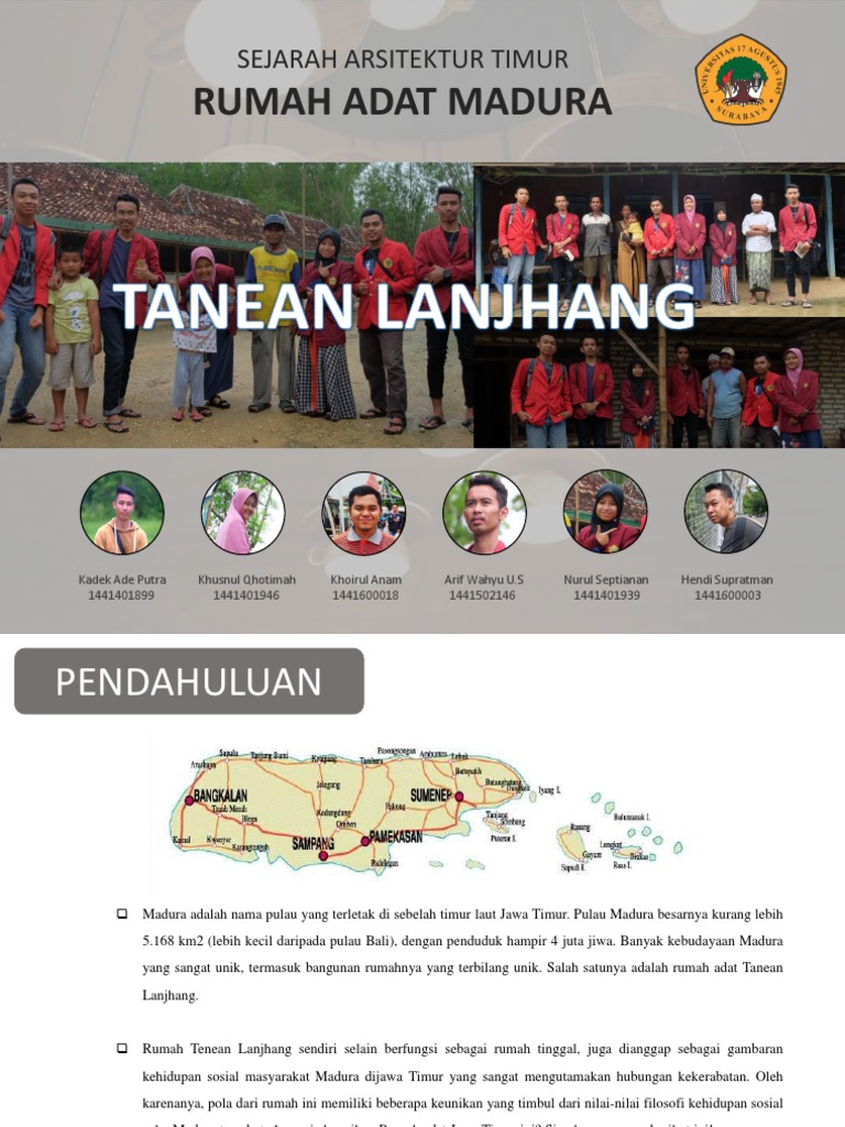 Rumah adat tanean lanjhang merupakan rumah adat yang berasal dari madura, rumah adat ini cenderung memiliki tampilan yang sederhana. Mohon dibaca untuk referensi size kaos. Bangkalan, pamekasan, sampang dan sumenenp. Rumah adat dan asalnya serta penjelasannya 34 provinsi, sketsa rumah adat joglo jawa tarian adat, senjata adat, pakaian adat di indonesia. Pulau madura besarnya kurang lebih 5.168 rumah adat madura ini dikenal dengan sebutan tanean lanjhang. Tanean lanjhang secara bahasa berarti halaman panjang. Rumah adat jawa timur bernama tanean lanjhang. Rumah adat di indonesia memiliki ragam bentuk unik. Beraneka ragam suku, agama, ras, golongan, tarian daerah, adat istiadat, lagu daerah menjadi sumber kekayaan bangsa indonesia yang tak ternilai harganya. Keliling kota bangkalan, melewati taman kota bangkalan, masjid agung bangkalan, pusat kota bangkalan, rumah makan. Apa nama rumah adat daerah ini, ya? Secara termonologi berarti halaman panjang. Baju madura, kaos madura, kostum madura, kostum pria, pakaian adat madura.
